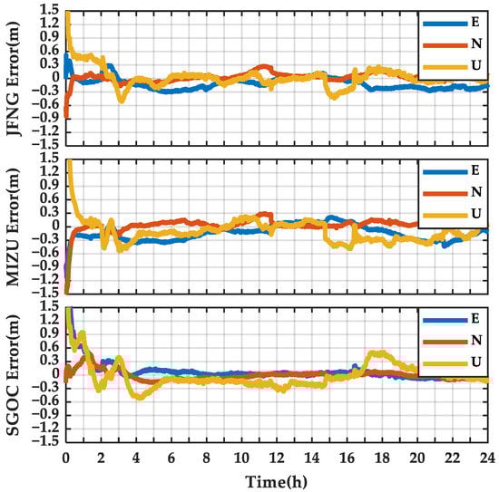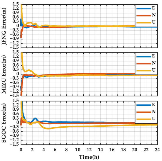 In Figure 21, the positioning errors of B2b PPP at the JFNG on E, N, and U components are within 0.3 m after convergence for the kinematic positioning mode. The horizontal components of the positions of the MIZU and the SGOC stations are similar to those of the JFNG. The U component error of the MIZU and the SGOC stations, however, is relatively large compared to that of the JFNG station. The maximum error of the U component is at SGOC station with 1.3 m, which is caused by poor observation geometrics and a lower number of available satellites with PPP-B2b corrections. The peak value can be easily observed on the SGOC station at epoch 10 h:18 m:00 s, 12 h:00 m:00 s, and 15 h:30 m:00 s, when the positioning error is larger than 0.9 m. The number of PPP-B2b available satellites at these epochs are less than 5, and the PDOP value is larger than 10, as shown in Figure 15 and Figure 17. In Figure 22, the positioning errors of WHU PPP of the three stations are similar and all of them achieve decimeter-level accuracy. The positioning performance of the SGOC station with WHU PPP, compared to that of B2b PPP, is not affected by the number of PPP-B2b available satellites. The convergence time of WHU PPP, however, is slightly longer than that of B2b PPP.