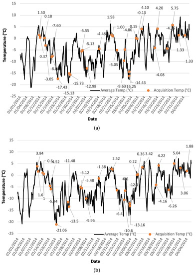 Hourly air temperature measurements from four weather stations adjacent to the Lake Erie shoreline and five weather stations adjacent to Lake Ontario were used to calculate the average temperature over the lakes during the study period (11 January to 4 April 2014). These temperatures, in addition to the ice analysis charts originally used for model training and testing, provided additional support for the model prediction maps. The average hourly air temperature measurements of Lake Erie and Lake Ontario are shown in Figure 2. Air temperatures corresponding to the times within the hour of SAR acquisitions are also shown in this figure.