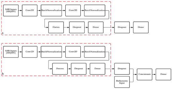 (a) Schematic architecture of a CNN using HH and HV backscatter patches for a custom loss function with two output units (b) Architecture of a CNN using HH and HV backscatter patches for a custom loss function with two output units and auxiliary dataset of bathymetry before fully connected layer.