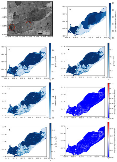 Ice maps of Lake Erie for 15 January 2014. (a) HH SAR image, the red solid line ellipsoid (region 1) indicates the region with dark ice that is misclassified by water using CNN without incorporating bathymetry, region 2 indicates open water where models misclassify some fraction of it as ice, and the red dashed line circle (region 3) presents ice that is classified as water by models (b) Ice concentration chart, (c–e,g) CNN predictions with mapped probability of each pixel belonging to water 0 and ice 1. Panel (c) is Baseline CNN model, (d) CNN with zonal bathymetry, (e) CNN with aleatoric uncertainty, and (g) CNN with both zonal bathymetry and aleatoric uncertainty. Panels (f,h) are aleatoric uncertainties of model predictions corresponding to CNN with aleatoric uncertainty (f) and aleatoric uncertainty and bathymetry (h).