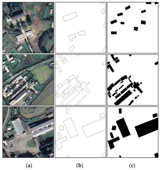 Illustration of satellite images and their ground truth. (a) Images from Satellite dataset II of the WHU Building Dataset [28]; (b) Ground truth boundaries; (c) Ground truth regions.
