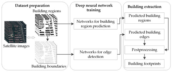 Although much progress has been achieved by DCNNs, incomplete building regions are likely shown due to the irregular shape or color variation. However, parts of the boundaries of these incomplete building regions may be detected by the deep edge-detection models. It is intuitive to combine the predicted building regions and boundaries to improve the incomplete building regions. The combination is completed by the postprocessing method in our building-detection framework (Figure 5). In detail, there are three major stages in our framework. In the first stage, building datasets, including original remote sensing images, their corresponding building regions and boundaries, are prepared for the next training stage. In the second stage, deep models are trained by the building regions or boundaries. According to the training strategies of the deep models (multitask or single-task learning), the building labels of regions and boundaries can be learned separately or simultaneously in the training stage. In the third stage, the candidates for the rooftop regions and boundaries can be obtained by the models trained in the second stage. Afterward, the predicted building regions and boundaries are combined by the postprocessing method to generate the final building footprints.