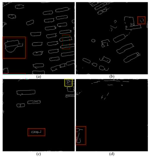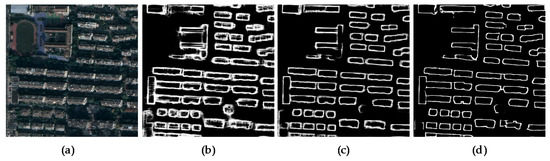 where E is the thresholding result, p(i) is the ith pixel of the predicted edge maps and is the threshold. For an 8-bit image output, is between 0 and 255. Here, we consider pixels smaller than the threshold as the background. In this way, the candidates for building boundaries are refined. Then, a fast thinning algorithm [60] is selected to generate one-pixel-wide building edge maps, in which building boundaries are not necessarily closed.