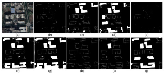 These are all pixel-based metrics and they are computed from the confusion matrix. From Equations (6)–(8), we can see that P shows the proportion of the true building predictions to the total building predictions, R represents the proportion of the true building predictions to the total building test samples and F1 considers both P and R in the way of their harmonic mean. The last metric, IoU (Equation (9)), indicates the percentage of the intersection of the predicted and ground truth building regions over the union of the predicted and ground truth building regions.