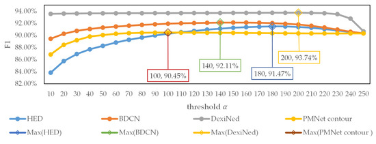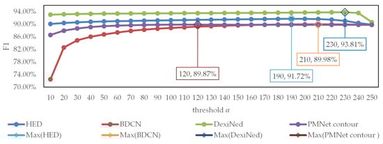 In the WHUEA dataset, threshold was also learned individually in different combinations of building regions and boundaries (Figure 11). The settings of and the searching space of threshold were identical to that in the XIHU dataset. From the evolution of F1 during the training stage (Figure 11), the settings of to generate one-pixel-wide building boundaries by HED, BDCN and DexiNed were 250, 250 and 240, respectively, for the combination with the building regions by U-Net, while the settings of were 180, 130, 220 and 160, 120, 200 for that by DeepLab and Mask R-CNN, respectively. Additionally, was set to 4 by considering both the image spatial resolution and building sizes in the study area.