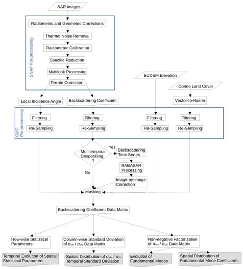 Figure 2 shows pre-processing and processing steps employed in this study. We use Ground–Range Detected (GRD) Sentinel-1A interferometric wide swath imagery [], provided by the European Space Agency (ESA) and downloaded from the Alaska Satellite Facility []. Level–1 GRD products consist of focused SAR data that has been detected, multi-looked and georeferenced to geographic coordinates using the Earth ellipsoid WGS84, but are still in SAR geometry. Thus, geocoding and radiometric terrain corrections are required, and are particularly important because of the high topographic variation in the study area.
