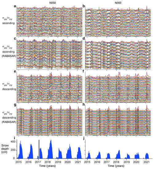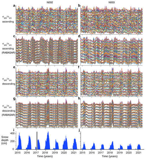 Time series of at two square grids of 9 × 9 pixels each, centered on stations N002 and N003, respectively. Panels (c,d,g,h) have been obtained after applying RABASAR to SAR images, in order to lower speckle noise and make plots more readable. All plots have been arbitrarily shifted along the y–axis for clearness. (a,c) Pixels nearby N002, ascending orbit. (b,d) Pixels nearby N003, ascending orbit. (e,g) Pixels nearby N002, descending orbit. (f,h) Pixels nearby N003, descending orbit. (i) Snow depth at N002, daily data; the gray rectangle indicates lacks of measurements. (j) Snow depth at N003, daily data.
