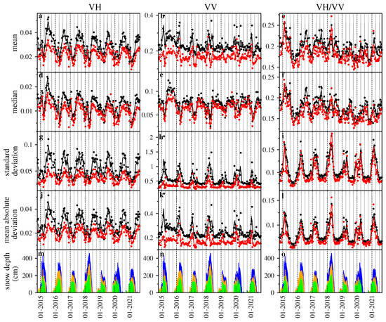 Comparison between temporal evolutions of selected statistical descriptors of the backscattering spatial distribution and snow depth. (a) Mean, . (b) Mean, . (c) Mean, . (d) Median, . (e) Median, . (f) Median, . (g) Standard deviation, . (h) Standard deviation, . (i) Standard deviation, . (j) Mean absolute deviation, . (k) Mean absolute deviation, . (l) Mean absolute deviation, . (a–l) Black dots, ascending orbit; red dots, descending orbit. Black and red lines give moving average over three consecutive black and red dots, respectively. (m–o) Snow depth (daily data) at stations N002 (blue), N003 (green), and N004 (orange).