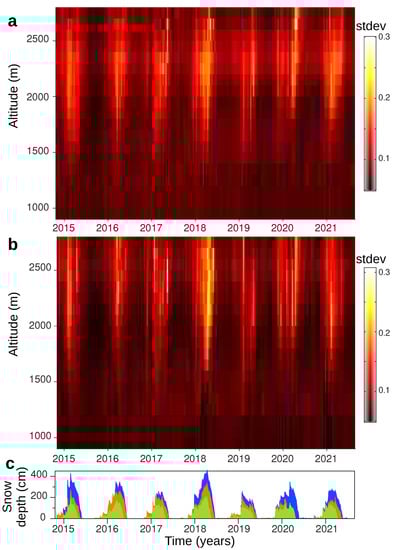 To deepen our understanding of the tool capability, we plot evolution of spatial dispersion by altitude. Evolution of stdev is shown in Figure 6; for comparison, mad evolution is shown in Supplementary Material Figure S5. As expected, time evolution of stdev and mad are very similar to each other regardless from altitude, although amplitudes may differ. Both stdev and mad evolve like SD at stations N002, N003, and N004 (Figure 6c) when considering altitudes higher than about 1500 m, i.e., where snowpack is persistent during the whole cold period []. On the contrary, stdev and mad yearly variations are small below about 1500 m. Thus, pixels at altitudes below 1500 m have a very small effect on plots in Figure 5i,l and, for brevity, we do not show a refined version of Figure 5 after removing pixels at altitudes below 1500 m.