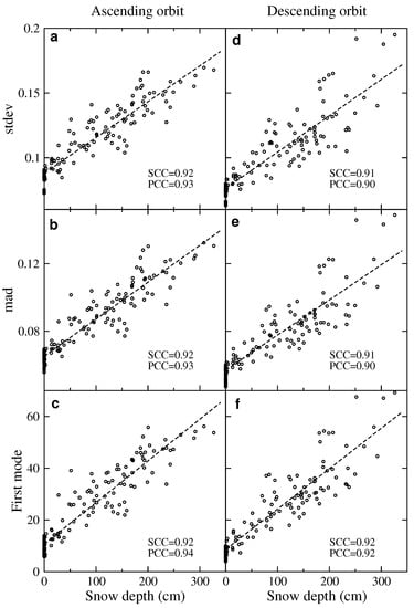 Correlation diagrams for evolution of and snow depth, computed as mean of N002 and N003 values. Pixel altitude is higher than 1500 m. (a) Spatial standard deviation, ascending orbit. (b) Spatial mean absolute deviation, ascending orbit. (c) First mode from non-negative matrix factorization, ascending orbit. (d) Spatial standard deviation, descending orbit. (e) Spatial mean absolute deviation, descending orbit. (f) First mode from non-negative matrix factorization, descending orbit. In each panel, SCC and PCC give Spearman’s (rank) and Pearson’s (linear) correlation coefficients, respectively.