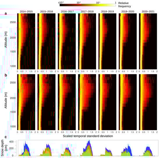 Spatial distribution of the standard deviation of evolution at each pixel, by altitude. Bivariate (2D) histograms give relative frequency of scaled temporal standard deviation by altitude. Scaled temporal standard deviation: standard deviation of evolution at each pixel computed each year in the period 1 October–30 September and divided by the mean over in each altitude band during the seven periods 1 July–31 August related to the seven investigated years. Sub-panels refer to different years. Altitude ranges 900–2800 m, at 100 m large intervals. (a) Ascending orbit. (b) Descending orbit. For comparison, (c) gives snow depth (daily data) at stations N002 (blue), N003 (green), and N004 (orange).