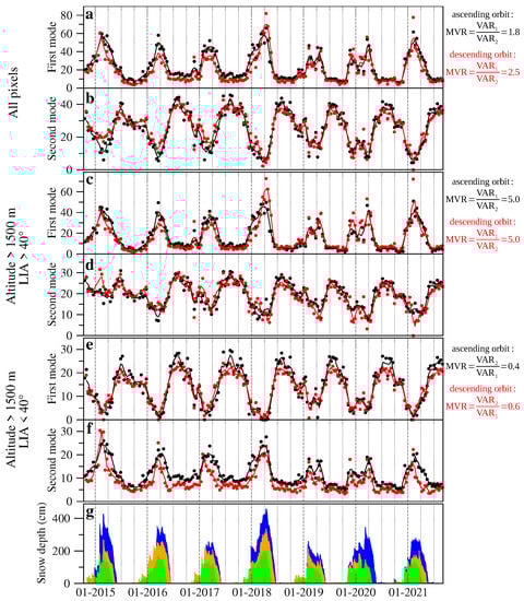 Fundamental modes of the time series. (a) Pixels at all altitudes, first mode. (b) Pixels at all altitudes, second mode. (c) Pixels at altitudes higher than 1500 m, LIA larger than 40, first mode. (d) Pixels at altitudes higher than 1500 m, LIA larger than 40, second mode. (e) Pixels at altitudes higher than 1500 m, LIA smaller than 40, first mode. (f) Pixels at altitudes higher than 1500 m, LIA smaller than 40, second mode. (a–f) Black dots, ascending orbit; red dots, descending orbit. Black and red lines give moving average over three consecutive black and red dots, respectively. For each case—all altitudes; altitudes > 1500 m and LIA > 40; altitudes > 1500 m and LIA < 40—MVR is ratio of total variance of evolution because of the fundamental mode correlated to SD evolution to total variance because of the fundamental mode uncorrelated to SD evolution. For comparison, (g) gives snow depth (daily data) at stations N002 (blue), N003 (green), and N004 (orange).