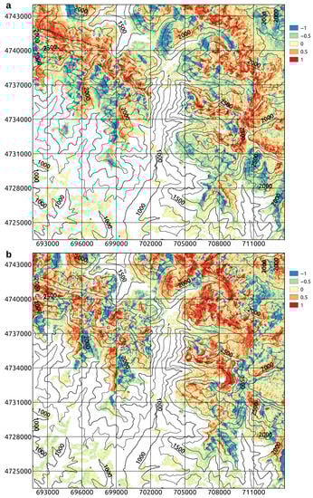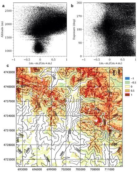 When we apply NMF to the combined data matrix which includes ascending– and descending– orbit images (Section 3), we obtain fundamental modes which are so similar to those plotted in Figure 9a–d that we think it useless to show them. MVR is 2.0. For each pixel we also compute using coefficients related to ascending– and descending–orbit images and select the larger one. That is to say, each pixel is assigned the orbit with the larger . As a result, the first fundamental mode predominates almost everywhere at altitudes higher than about 1500 m (Figure 12a,c). First mode predominance decreases on south–facing slopes, as expected (Figure 12b).