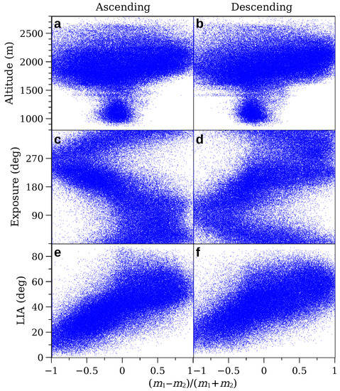 Figure 10 shows distribution in the study area, for both (a) ascending and (b) descending orbits. At altitudes higher than around 1500 m, pixels where for the ascending orbits usually have for the descending orbits and vice versa, even if many other pixels have for both orbits. At lower altitudes, is usually small and negative, thus the yearly oscillating behavior slightly dominates. The different behavior of pixels located below or above 1500 m is confirmed by the scatter plots in Figure 11a,b, and it is consistent with the persistent snow line altitude during cold months. Thus, we only consider pixels located above 1500 m to further investigate possible correlations. Scatter plots in Figure 11c,d suggest strong correlation between and North-to-East exposure. However, eastern exposure gives for ascending orbits and for descending orbits; the opposite occurs for western exposure, thus correlation between exposure and is a consequence of the satellite line-of-sight azimuth. On the contrary, correlation between and LIA is very similar for ascending and descending orbits (Figure 11e,f), suggesting that LIA actually drives .