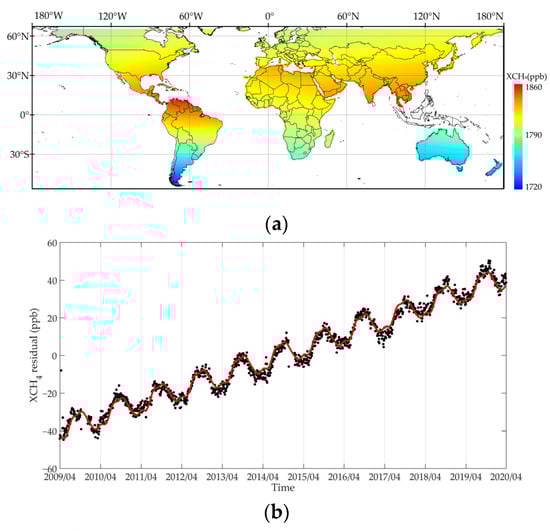 The trend components derived from eleven years of GOSAT data from April 2009 to April 2020 where (a) is the spatial trend of XCH4, and (b) is the temporal trend (red line) derived by fitting the annual harmonic function and a linear function to the time series of XCH4 residuals (blue dots), which is calculated by averaging the spatially detrended XCH4 data.