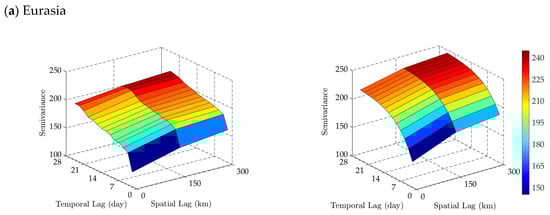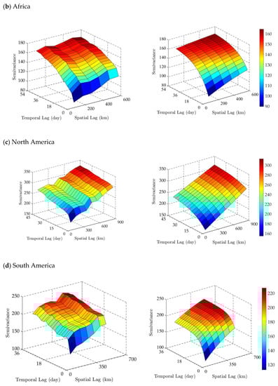Figure 4 presents the different experimental variogram (left) for the five regions calculated from all GOSAT retrievals by Equation (4) and its fitted variogram model (right) by the product-sum model for five regions. In the variograms shown in Figure 4, the semi-variance values are called nugget and sill when spatial and temporal lag are closet to 0 and infinity, respectively. The ratio of nugget to sill, expressed as a percentage, can be used as an indicator to classify data dependence []. In general, a ratio larger than 0.75 indicates a strong spatial or temporal dependence. Table 1 presents the parameters of spatiotemporal variation in five regions. The ratio values of nugget to sill for all regions shown in Table 1 are less than 0.75, which indicates an overall spatial and temporal dependence. The ratio in Eurasia and South America are the lowest which indicates stronger spatial and temporal dependence than the other three regions.