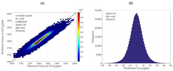Figure 5 shows the biases of the predicted values comparing with the corresponding observed values by the cross-validation. The results of cross-validation, as shown in Figure 5, present a significant correlation coefficient (R2) of 0.97 which indicate small prediction biases between the observed XCH4 and the predicted XCH4 data, where the mean MAE is generally 7.76 ppb and the standard deviation (STD) is 6.91 ppb. Figure 5a demonstrates a systematic bias where the observed XCH4 tends to be larger than the predicted XCH4 mostly at high concentrations, while it is smaller than the predicted XCH4 mostly at lower concentrations. This is likely related to the effects of the sensor capability and sensitivity in GOSAT observations for areas with extremely high and low concentrations. The statistical results of cross-validation for the five regions are show in Table 2. It can be seen from Table 2 that the number of predicted data with MAE less than 15 ppb accounts for greater than 83 percent of all validated samples (N). The biases in Eurasia and North America are larger than those in the other regions likely due to the diverse and active surface XCH4 emissions in the two areas.