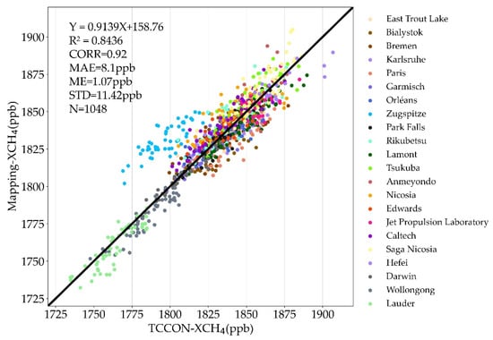 XCH4 from TCCON measurements has high accuracy and can be used for validation of the Mapping-XCH4 []. In this study, we selected 22 representative TCCON sites where XCH4 measurements were available from 2015 to 2019. We took 1° × 1° grid and one month as a space-time unit to calculate the mean values of TCCON. Figure 7 shows the biases of Mapping-XCH4 by the comparison of the XCH4 measurements (X-axis) over TCCON sites plotted in different colors and the Mapping-XCH4 (Y-axis) that coincide with TCCON sites in geolocation and time. As seen from Figure 7, the correlation coefficient (CORR), indicating consistency between Mapping-XCH4 and TCCON data, is as high as 0.92, and the mean absolute error (MAE), mean error (ME), and standard deviation (STD) are 8.1 ppb, 1.07 ppb, and 11.42 ppb, respectively.