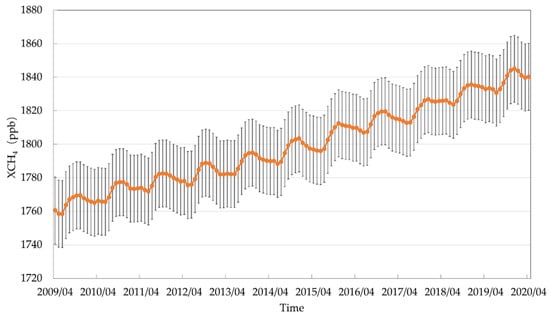 Temporal variability in monthly mean XCH4 from April 2009 to April 2020 calculated from Mapping-XCH4 data, where the vertical line in black is the standard deviation of global Mapping-XCH4 data in a month.