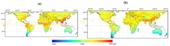 Atmospheric methane (CH4), as one of the most important greenhouse gases, is second only to carbon dioxide (CO2) in contributing to global warming []. The global atmospheric CH4 concentration has increased from a preindustrial level of 722 ppb to approximately 1750 ppb in 2000 and continues to increase [,,,] due to the influence of anthropogenic emissions such as fossil fuel combustion, agricultural planting, livestock husbandry, biological emissions, etc. [,]. Countries all over the world have begun to take actions to reduce CH4 emission to prevent the continuous increase of atmospheric CH4 concentrations []. It is necessary to develop a spatiotemporally continuous CH4 data on a global scale to aid in understanding the spatial and temporal variabilities in CH4 emissions so as to support the actions of CH4 emission reduction [,].