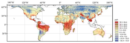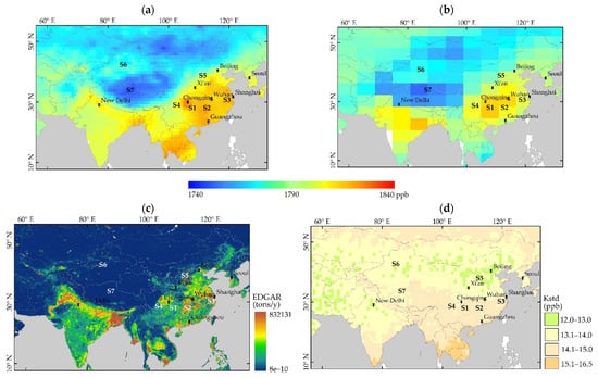Figure 13 demonstrates the spatial pattern of annual mean XCH4 in 2010 derived from the Mapping-XCH4 and CT-XCH4, respectively, the anthropogenic emissions from EDGAR and the uncertainty (Kstd) of Mapping-XCH4 in the same year. Comparing Mapping-XCH4 with CT-XCH4, as shown in Figure 13a,b, we can find that Mapping-XCH4 reveals a finer spatial variation than CT-XCH4. The spatial pattern of Mapping-XCH4, moreover, is in better agreement with the CH4 emissions of EDGAR (Figure 14) than that of CT-XCH4. In particular, the Sichuan Basin in China, Bangladesh, and northern India with large emissions corresponds to high values in Mapping-XCH4. These large CH4 emissions are mostly related to paddy fields, fossil fuel production and use, and the stagnant effect of the basin terrain []. Satellite observations of CO columns and NO2 columns indicated the large magnitude of industrial emissions over this region also []. The Mapping-XCH4 does not respond to surface emissions only in the southern tip of the peninsula of South Asia where the large uncertainty of Mapping-XCH4 (Figure 13d) due to a smaller number of available XCH4 retrievals (Figure 1a). These results indicate that the Mapping-XCH4 can reveal and capture the local CH4 emissions in space and time as the Mapping-XCH4 is generated by instantaneous satellite observations that respond to surface emissions [,].
