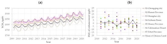 Figure 10 shows the timely variation in globally average XCH4 from 2009 to 2020. The globally average XCH4 presents an annual increase from 2009 to 2020 and seasonal variation which are in agreement with the Global Atmosphere Watch (GAW) report []. The maximum XCH4 appeared in November and December, and the minimum appeared in June and July. The seasonal amplitude was up to 11.4 ppb. The seasonal variation in XCH4 is partly driven by the abundance of hydroxyl radicals (OH), the most important sink of CH4, in the atmosphere. As a result, a high abundance of OH in the summer drives down XCH4 [,]. Regionally, it could be related to the growth cycle of paddies and vegetation, as well as the change in temperature and humidity caused by the influence of monsoons []. Higher temperature and humidity will increase CH4 emissions. Wetlands, such as swamps and lakes, have significant CH4 emissions due to anaerobic environments [,].