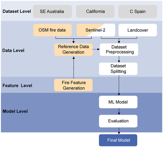 Visualization of the combined classification framework of fires and burned areas divided into the dataset level, the data level, the feature level, and the model level. The following abbreviations are used: SE—southeast; C—central; ML—machine learning.