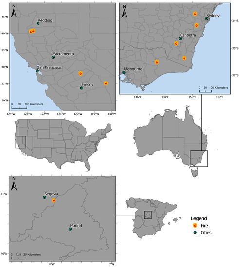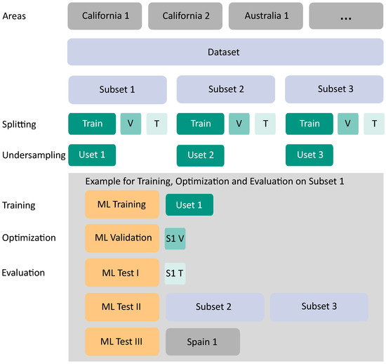 Since we aimed to develop a generic approach including supervised ML models for fire detection and burned area mapping, the selection of the study area had to meet two main criteria. First, the study area should include different regions worldwide characterized by big fires in the last few years. Second, a variety of land use and land cover classes should be part of these selected regions. Therefore, we relied on two big fires in two different regions and countries: California (United States of America (USA)) and the southeast (SE) of Australia (States of Victoria, Australian Capital Territory, and New South Wales). Figure 2 visualizes the locations of the fires used for the training, validation, and testing of the ML approaches. Detailed information about the distribution of the training, evaluation, and test data subsets concerning the different regions is given in Section 2.2.4. The specific fire sites were selected as well distributed within the regions matching the second-mentioned criterion. In sum, four areas in California and five areas in Southeast Australia, mainly containing different land cover classes, were used in the ML process. Besides, to evaluate the generalization abilities of the selected ML models, an additional study area was selected located in the central region of Spain (see Figure 2). Here, one area was chosen for the testing process.