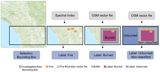 Finally, in the last step, we needed to label the remaining pixels inside the bounding box area that had not been labeled yet. A pixel was already labeled as Fire if it was classified as fire by the AFD-3 index according to Step 2. A pixel was already labeled as Burned if it was located within the OSM boundary, not classified as fire, and not located within the buffer zone according to Step 3. The label Non-classified was provided for pixels located within the buffer and not labeled as fire. For these pixels, we could not be sure to which class they truly corresponded from the references that were available to us. We discarded these pixels to obtain only pure data points as the input for our models. Eventually, we labeled pixels outside the OSM boundary and outside the buffer as Unburned.