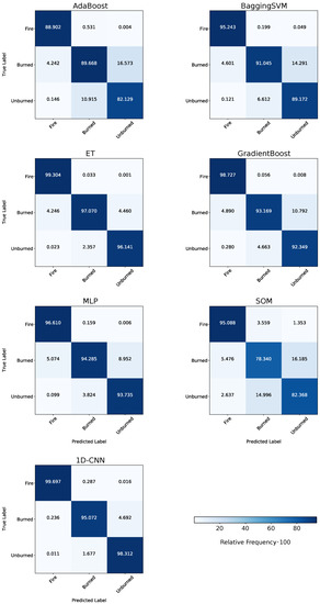 In contrast to the revised fire detection approaches, we used indices in the first step [15] and then worked with supervised approaches to improve the correctness of fire area detection and achieve a trustworthy fire map to be further used in the applications. Supervised approaches have also been applied in burned area detection and have achieved good results [12,31]. Therefore, we focused on the use of similar approaches in our study. Since many different supervised approaches were applied in the previous studies, we did not focus on a single approach, but tested several different ones.