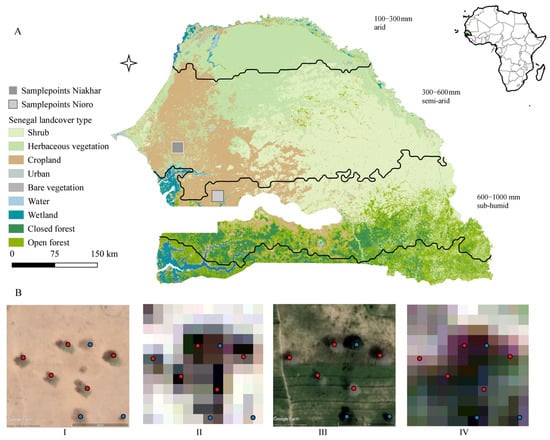 (A) Location of Senegal and land use/cover map of 2019 (Copernicus Global Land Service at 100-m resolution). The precipitation data are derived from the CHIRPS long-term (1981–2019) yearly average. The rainfall zones of 100–300 mm, 300–600 mm and 600–1000 mm are categorized as arid area, semi-arid area and sub-humid area. The two grey boxes represent locations of data sampling in Niakhar and Nioro. (B) Examples of Faidherbia albida trees (red dots) during the (I) dry and (III) rainy season from Google Earth. Image (II) and (IV) represent the corresponding stretched true colour images from Sentinel-2 at 10-m resolution. Blue points represent other tree species.