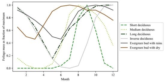 Seasonal distribution of leaf mass depending on the phenological type of woody plants in the Sahel []. The inverse deciduous type represents Faidherbia albida trees.