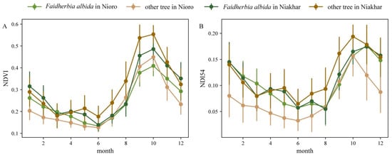 Averaged monthly (A) NDVI and (B) NDI54 values for sample pixels of Faidherbia albida and other species in the regions of Nioro and Niakhar. Vertical lines represent the standard deviation of the sample population. Overall, 1418 pixels were sampled and averaged over the study period, including 57 Faidherbia albida pixels and 112 pixels with other tree species in the Nioro region, and 459 Faidherbia albida pixels and 790 pixels with other species in the Niakhar region.