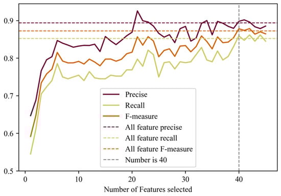 The performance metrics of recall and precision were used to evaluate models using different feature collections []. Precision is defined as the fraction of relevant instances among the retrieved instances, i.e., the number of true positives divided by the total number of elements labelled as belonging to the positive class. Recall is defined as the fraction of relevant instances that were retrieved, i.e., the number of true positives divided by the total number of elements that actually belong to the positive class. The true positives refer to the elements correctly labelled as belonging to the positive class, here, Faidherbia albida trees. The elements labelled as belonging to the positive class is the sum of true positives and false positives, the latter which are instances incorrectly labelled as belonging to the class. The elements that actually belong to the positive class are the sum of true positives and false negatives, which are the elements that were not labelled as belonging to the positive class but should have been. Recall and precision scores are often inversely related. Taking the harmonic average of precision and recall leads to the F-measure (a measure that combines precision and recall):