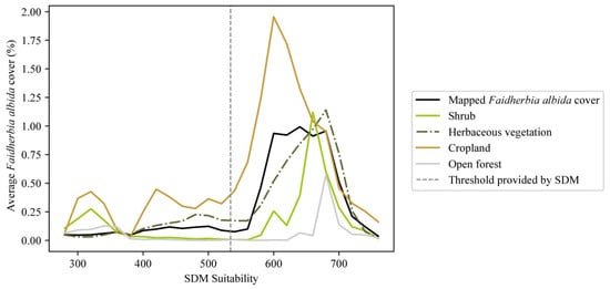 Average Faidherbia albida cover (%) in relation to modelled suitability scores (intervals of 20 units) for different land use/cover types. The land use/cover map of 2019 is provided by Copernicus Global Land Service at 100-m resolution. Wetland, urban, water, bare vegetation and closed forest types were not included in this comparison due to the limited number of observations.