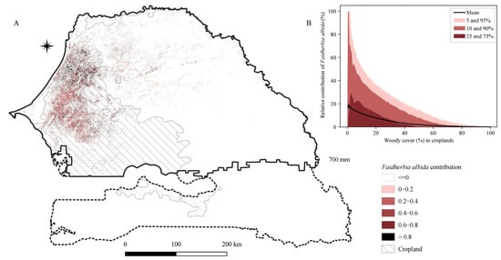 By combing the woody cover map from Zhang et al. [] and our results, we calculated the relative contribution of Faidherbia albida trees to the overall woody plant cover per hectare (Figure 7). The map of this relative contribution shows the degree of dominance of Faidherbia albida among woody plant cover. The higher the contribution of Faidherbia albida to the woody plant cover, the lower is the woody plant diversity. Furthermore, in areas where woody cover is nonzero, the contribution of Faidherbia albida to cover as a function of all woody species cover is illustrated in Figure 7B. The relative contribution of Faidherbia albida in croplands is on average 7.23%, with several areas being dominated by Faidherbia albida.