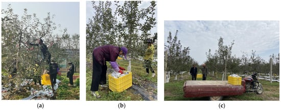Manual apple picking and handling. (a) Climbing ladders for apple picking; (b) picking and placing in fruit boxes; (c) placing apple boxes on the transport truck.