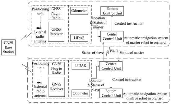 An overall framework of the orchard master-slave navigation system, including the automatic navigation system of the orchard master robot and slave robot, is depicted in Figure 2. The autonomous navigation system for the master-slave robot is the same basically, mainly including the positioning unit, the central control unit, and the bottom control unit. The positioning unit consists of an RTK-GNSS (includes GNSS plug in the radio, a GNSS receiver, external radio antennas, and GNSS base station), LIDAR, and odometer to provide positioning and operational status information to the central control unit of the robot. The central control unit streams its status data with the central control units of other robots via Wi-Fi, makes judgments based on the status information of other robots and the information provided by the positioning unit itself, selects the navigation mode applicable to the current working environment, and sends control commands to the underlying control unit.