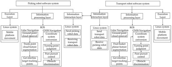 The system software of the combined orchard harvesting robot runs on a Linux system, and the system software of each robot is composed of three modules: an information interaction layer, an information processing layer, and an execution layer. The software system structure is shown in Figure 4. The information interaction layer is based on the Linux system model for data interaction between the picking robot and the transport robot. The information processing layer is based on the robot operating system (ROS) navigation program for the picking and transport robot group, and the execution layer is based on the Linux system mobile platform control. According to the speed information output from the information processing layer to the underlying servo controller, the autonomous walking of the picking and transporting robot is realized.