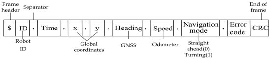 Where x and y are global coordinates, the robot heading and speed are obtained by the GNSS and odometer, respectively, and the navigation mode is divided into straight ahead (0) and turning (1). The data frame format of said communication protocol consists of a start character, an identifier, a data bit, a check bit, and a termination character. The data frame starts with the “$” symbol and ends with the cyclic redundancy check (CRC). The CRC is divided into the robot identity document (ID), the current time, the global coordinates X, Y, the heading, the navigation mode, and an error code indicated by “,”. The identifier of the data corresponds to the number of robots, i.e., the robot ID. The ID of the transport robot is 1 and the ID of the picking robot is 2.