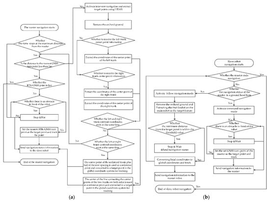 Software structure of the orchard master-slave robot cooperative navigation system. (a) The master robot navigation strategy; (b) the slave robot navigation strategy.