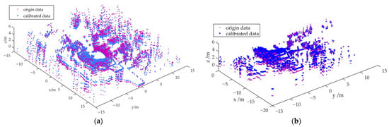 The point cloud data acquired from the LIDAR is angularly transformed by the rotation angle to obtain calibrated point cloud data. Due to the difference in the point cloud usage of the robots, the point cloud scan of the master robot is taken as [0,2π] and the point cloud scan of the slave robot is taken as [0,π]. The LIDAR point cloud calibration of the master robot in Figure 7a,b shows the LIDAR point cloud calibration for the slave robot.