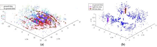The point cloud is first divided into a grid (the size of a piece of the grid is 0.2 × 0.2 m), and the original point cloud and the grid-like point cloud are projected onto the same plane to find the nearest point of each point cloud and save the height information of the original point cloud. For the point cloud in a single grid, the displacement of the point cloud by gravity is then calculated by Equation (4), compared with the height of the point cloud before projection and iterated until the height change reaches a set threshold or iterated to a set value (set to 500). Finally, the displacement value is obtained from Equation (6), and when the displacement is less than the set value (set to 0.2 m), it is regarded as a ground point, or if greater, is regarded as a non-ground point. As shown in Figure 8a, in the calibrated LIDAR point cloud the above method is used to divide the point cloud into a non-ground point cloud and a ground point cloud, where the red points are ground, and the blue points are non-ground points clouds.
