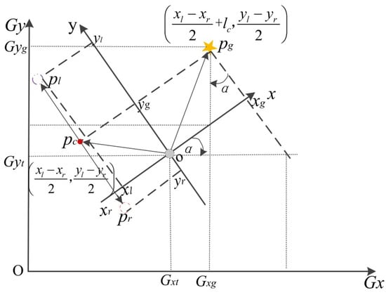 In Equation (7), Gxg and Gyg are the horizontal and vertical coordinates of the target point pg in the global coordinate system, xg and yg are the horizontal and vertical coordinates of the target point pg in the local coordinate system of the LIDAR, Gxt and Gyt are the horizontal and vertical coordinates of the LIDAR in the global coordinate system, and α is the rotation angle between the LIDAR coordinate system xoy and the global coordinate system GxOGy.