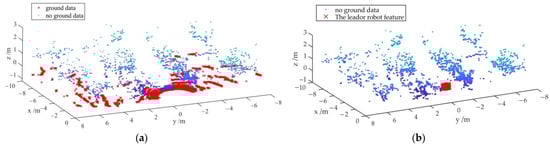 In between the rows of apple trees, the slave robot uses the following navigation mode, after information exchange with the master robot, when the slave robot needs to extract and track the apple basket feature points on the master robot in front of it and use the feature points to track the master robot. As with the method of non-ground point cloud extraction by the master robot, the non-ground point cloud needs to be segmented from the calibrated point cloud using the Equations (1)–(6). The segmented result is shown in Figure 10a. A conditional filter is used in the non-ground point cloud to determine the following range of the slave robot. The area chosen here is the range where the robot radar is the origin, the front is less than or equal to 2 m, the left and right sides are less than ±0.5 times the row spacing, and the height is less than the canopy height.