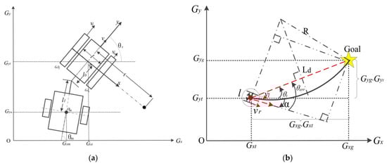 Geometric analysis of the pure pursuit algorithm. (a) Traction orchard transporter movement model; (b) geometric analysis of pure pursuit algorithm for differential motion model in the global coordinate system.