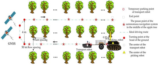 According to the actual operational requirements of orchard harvesting, the combined orchard harvesting robot needs to complete the action of stopping and going straight repeatedly, according to the tree planting pattern, when driving independently between rows. It does not need to stop when turning at the head of the ground to improve the operational efficiency. At the same time, the picking robots in this combined orchard harvesting robot needs to keep a minimum distance from the tractor-drawn transport robots driving in front of it to ensure that the arm of the picking robot can put the apples in the apple box and the two robots cannot collide. Therefore, the combined orchard harvesting robot uses different target feature approaches for inter-row and ground turns. GNSS is used to determine target feature points for ground turns and LIDAR is used to determine target feature points for in-row turns.