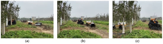 Picking and transporting robots carrying out autonomous navigation trials in an orchard. (a) Start turning at the head of the ground; (b) picking and transporting robots turn at the same time; (c) start of apple tree in-row navigation.