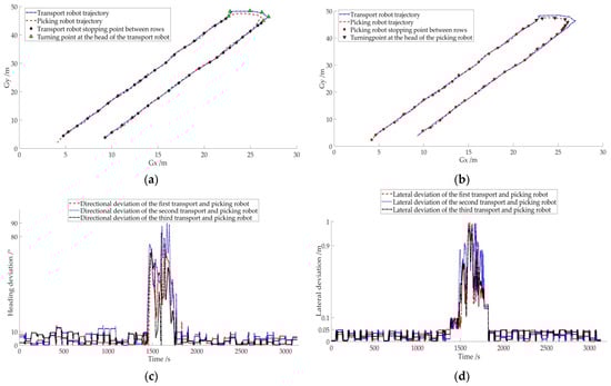 The actual walking paths of the transport robot and the picking robot in the orchard are shown in Figure 18, where the stopping points of the transport robot in this path are shown in Figure 18a and the stopping points of the picking robot in this path are shown in Figure 18b. It can be seen that the routes of the two robots almost overlap when driving between rows, and the intervals between the stopping points are almost the same, but there is a large position error when turning. To analyze the operation of the autonomous navigation system of the combined orchard harvesting robot more visually, the course deviation and lateral deviation between the two robots were calculated and plotted in Figure 18c,d. It is obvious from the figure that when driving at the head of the orchard, the heading deviation of the two robots was mostly within 0.05 m, and the lateral deviation was 10°, with a small variation. While the maximum value of heading angle deviation was less than 90° and the maximum value of lateral deviation was less than 1 m when the ground head turned, and the change was drastic. This is similar to the variation of heading angle and lateral deviation in Figure 12 of the previous simulation experiment.