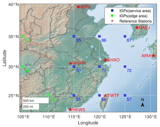 Seven stations from the International GNSS Service (IGS) are treated as SBAS reference stations in this research, namely, BJFS, WUHN, SHAO, HKWS, TWTF, DAEJ, AIRA. GPS constellation and observation data are employed. The distributions of experimental IGPs and reference stations are shown in Figure 1.